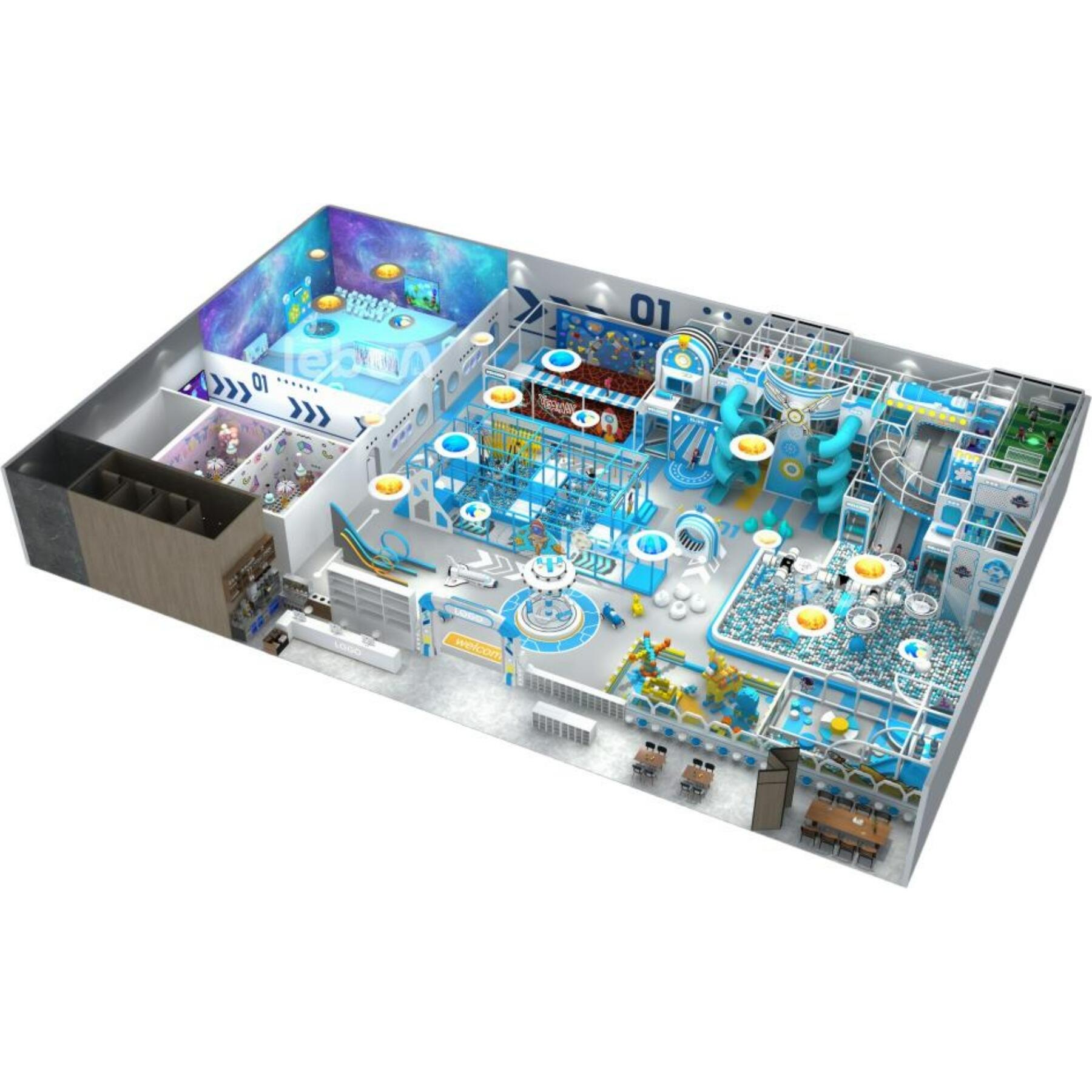 Il s'agit du plan de conception d'une aire de jeux pour enfants. Globalement dominée par le bleu et le blanc, elle crée une atmosphère rêveuse liée à l'univers et à la technologie. L'aménagement spatial est varié, comprenant des zones de divertissement telles que des toboggans, des piscines à balles océaniques et des structures d'escalade, ainsi que des espaces de repos. Elle allie divertissement et détente, répondant ainsi aux besoins de jeu des enfants et à l'accompagnement des parents, tout en créant un espace immersif de divertissement pour enfants.